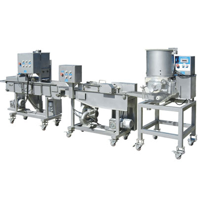 全自動漢堡肉餅、雞柳、魚排生產(chǎn)線可以自動完成成型、上漿、上粉、上面包屑等工序,生產(chǎn)線自動化程度高操作簡便。